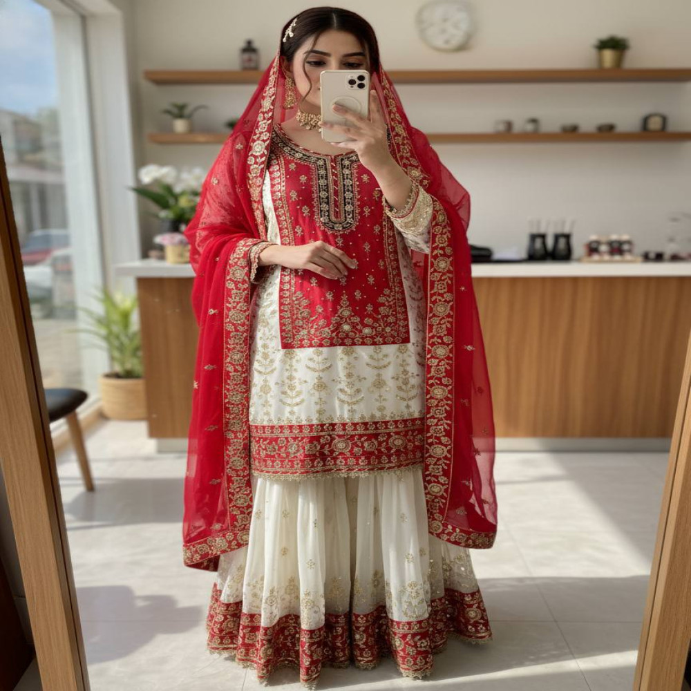 Kurti: Beautiful Faux Georgette with micro inner, 5mm sequins & zari embroidery with pearl moti work. Fully stitched Kurti length 41–42 inches. Sharara: Faux Georgette, fully stitched free size up to 44, length 40–41 inches. Dupatta: Faux Georgette, 2 meters with embroidery work. Weight: 0.900 kg.