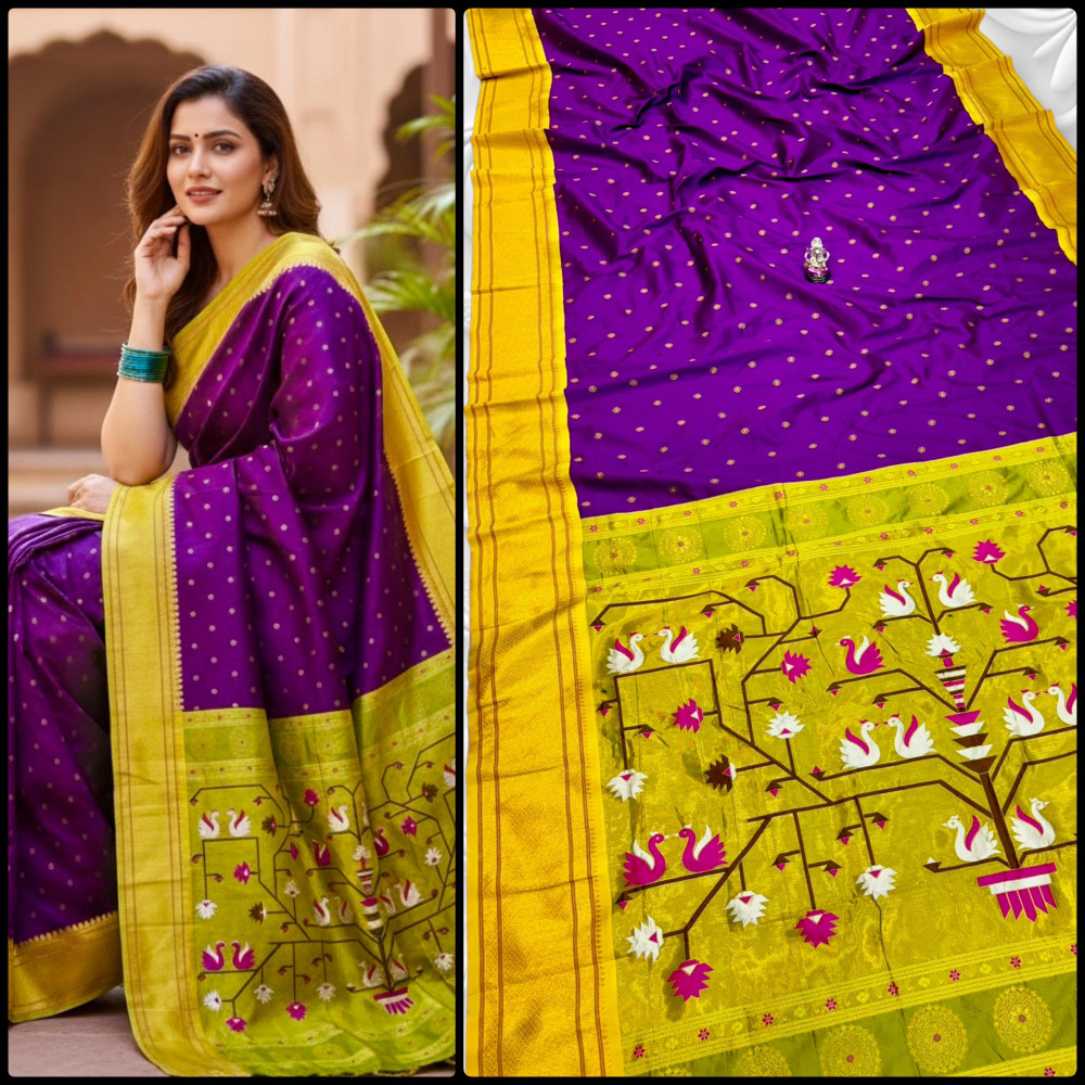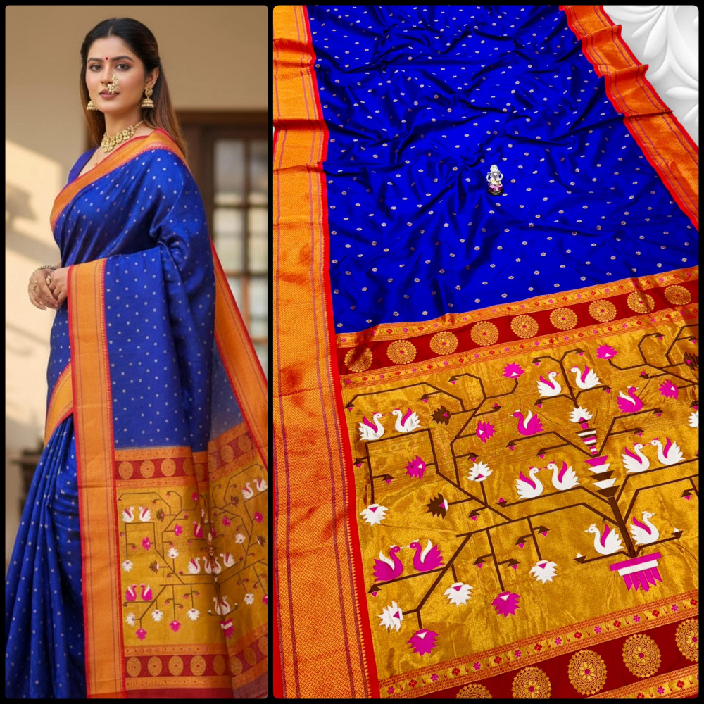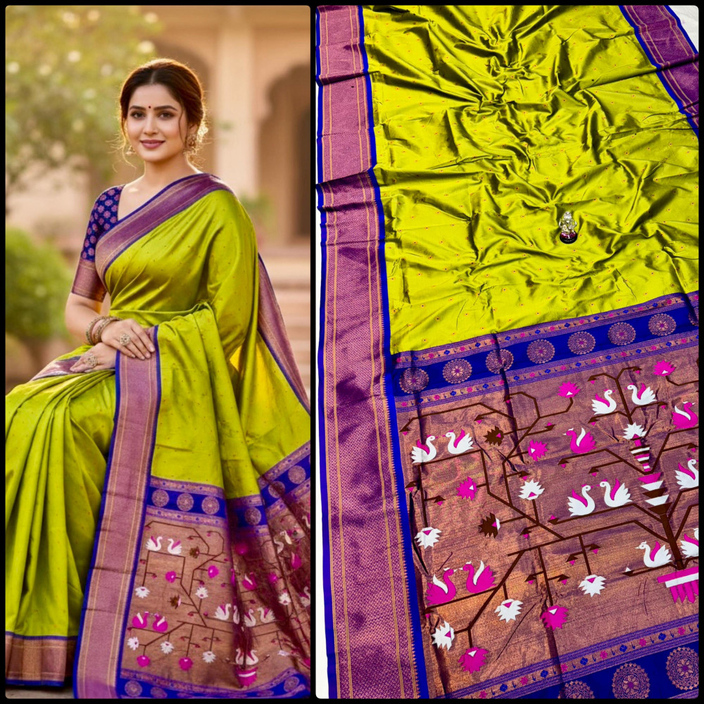 Premium Paithani saree with rich swan pallu design, zari border, and all over Meena butti. Comes with contrast designer blouse piece. Perfect for festive and wedding wear.