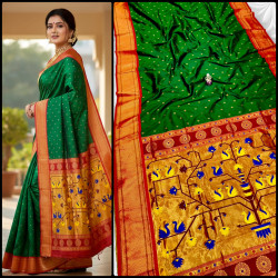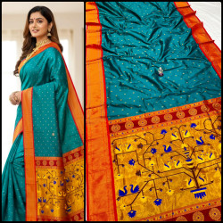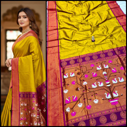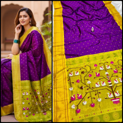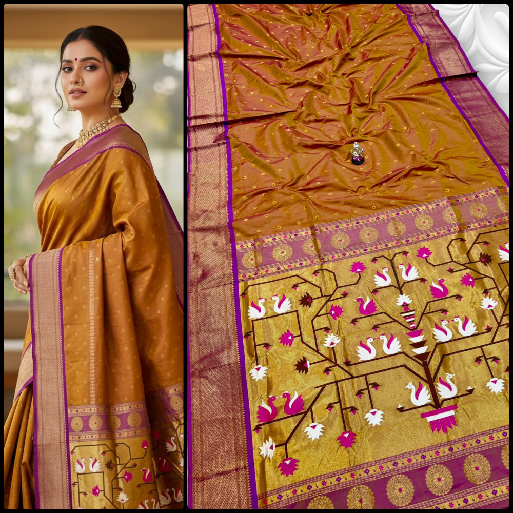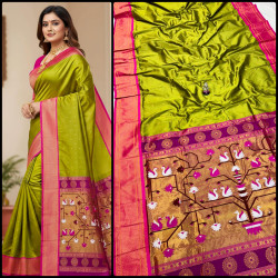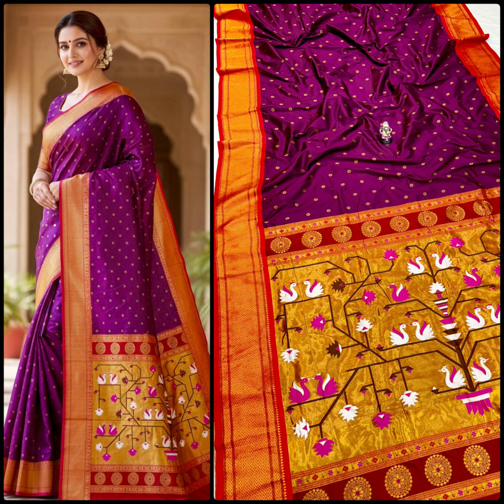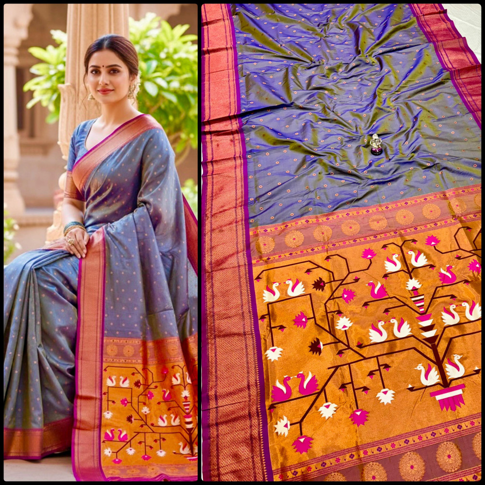 Premium Paithani saree with rich swan pallu design, zari border, and all over Meena butti. Comes with contrast designer blouse piece. Perfect for festive and wedding wear.