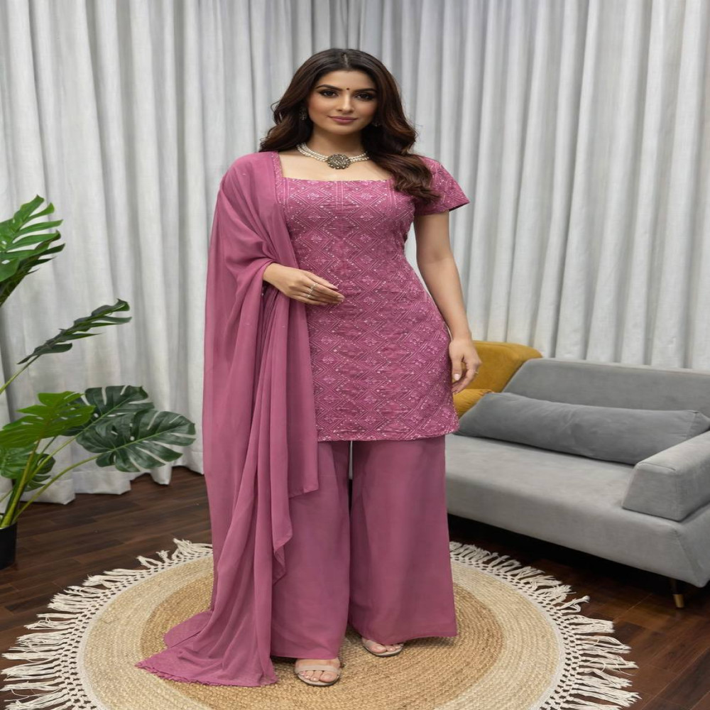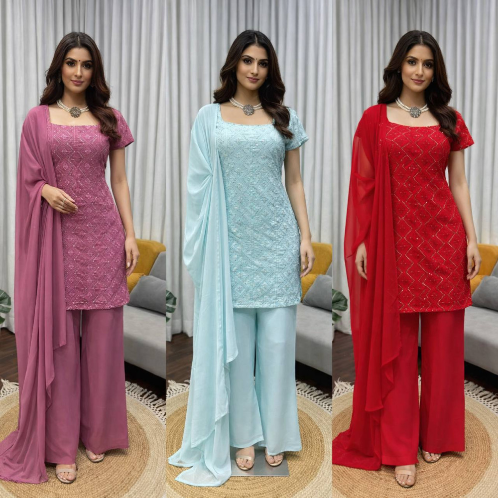 #Beautiful Plazzo Set FAUX GEORGETTE #TOP FABRICS :HEAVY FUAX GEORGETTE #TOP WORK : HEAVY CHINE SEQUINS WORK #TOP LENGTH : 35 INCHED #TOP INNER : MICRO COTTON #PLAZZO FABRICS : FUAX GEORGETTE #Beautiful FAUX GEORGETTE #PLAZZO LENGTH : 39 INCHED #PLAZZO SIZE : FULL STITCHED ( FREE SIZE ) #PLAZZO WORK : PLAN # PLAZZO INNER : MICRO COTTON #DUPATTA : FUAX GEORGETTE #DUPATTA WORK : PLAN #DUPATTA SIZE : 2.10-2.20 MTR WEIGTH : 850GM Available Size: 38,40,42,44