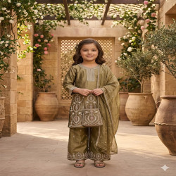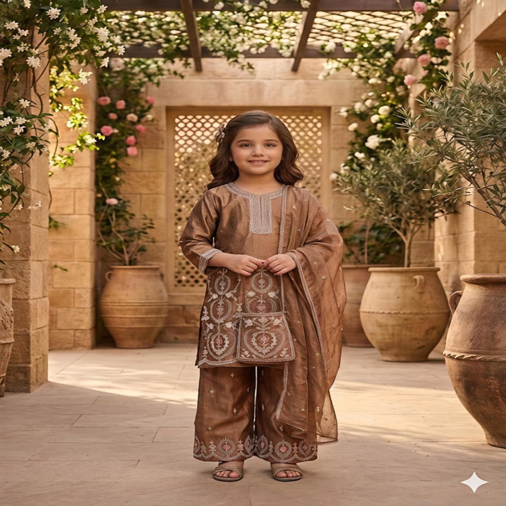 A dreamy and elegant 3-piece kids suit set crafted with intricate hand embroidery and premium fabric for a graceful look. 🌸 The Look Top: Fand Satin tunic with heavy hand bead embroidery & designer sleeves Bottom: Flared Fand Satin plazo for comfort and style Dupatta: Elegant dupatta finished with signature Gota lace 🎨 Color Options 🍫 Enchanted Chocolate 💎 Celestial Sky Blue 📏 Perfect Fit Comfortable fit designed for kids Ideal for festive wear, weddings & special occasions